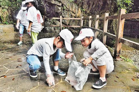 重庆万盛黑山谷景区,小志愿者们在捡拾垃圾,用自己的行动号召游客文明出行。