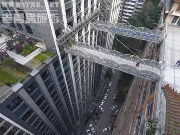 别个天桥是过哈马路,重庆这个天桥过个马路还要上十几层楼。重庆渝中区一栋大楼从22层架起两座平行的天桥,连接对面的魁星楼广场地面。这两座约23米长的空中连廊离地达68.5米,站在天桥向下看去可谓“深不见底”。